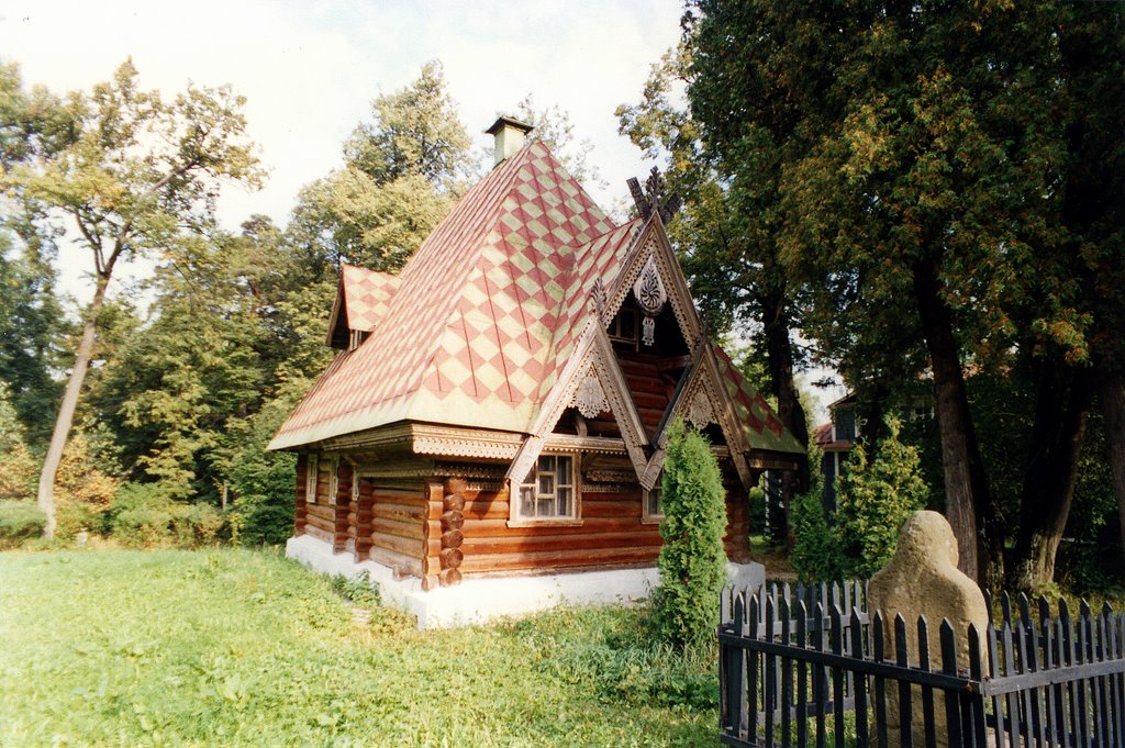 Далее по большой лужайке и через окружающие деревья вы найдете баню, которая позже использовалась как дом отдыха и письменная комната. Построенный в традиционном стиле, он наполнен выдающейся мебелью русского модерна с красивыми резными узорами в народном стиле, многие из которых украшены символом колонии — совой. Напротив стоит маленькая «Избушка на курьих ножках», построенная в честь Бабы Яги, ведьмы из старинных русских сказок.