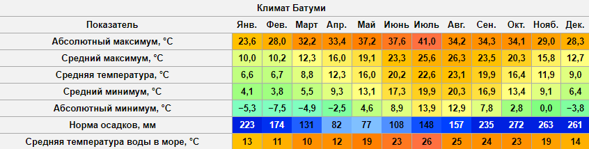 Купальный сезон на черноморском побережье длится с конца мая по конец сентября. Причем характерной чертой многих грузинских курортов является довольно облачная погода в начале и конце сезона. Она нисколько не мешает загару, поскольку облака не препятствуют ультрафиолетовому излучению, да и температура воздуха весьма приятная, однако общая влажность воздуха бывает не всем комфортна.